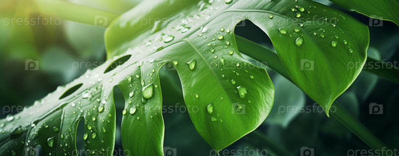 Фон из зеленых листьев тропических джунглей, папоротника, пальмы и Monstera Deliciosa на стене с темно-зеленым фоном концепции цветочного лесного растения, горизонтальный