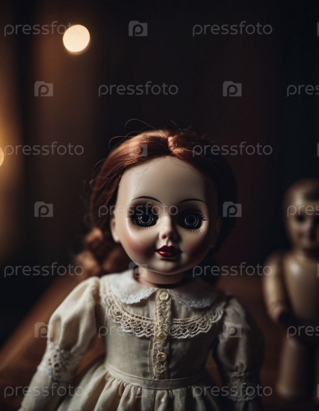 Тревожная кукла с темными глазами и рыжими волосами привлекает внимание в темной среде с мягким рассеянным освещением, отражающим жуткую атмосферу. Страшная кукла для ужасов и Хэллоуина. ИИ