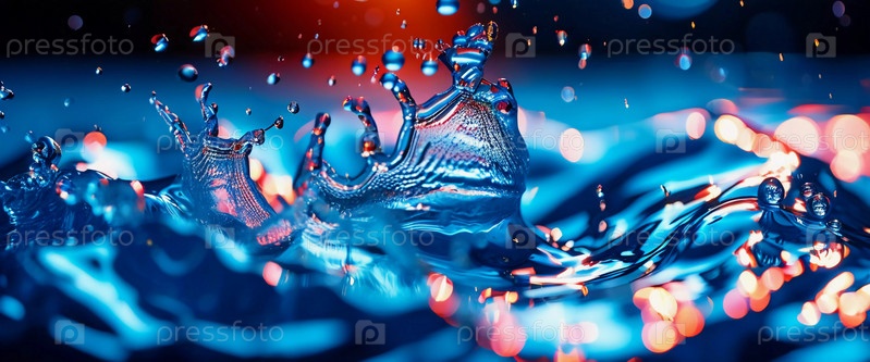 Яркие синие капли воды создают потрясающий всплеск, улавливая энергию и движение в ярком отображении цвета. Момент кажется живым и ярким, демонстрируя красоту природы. Замораживающее движение. Генеративный ИИ