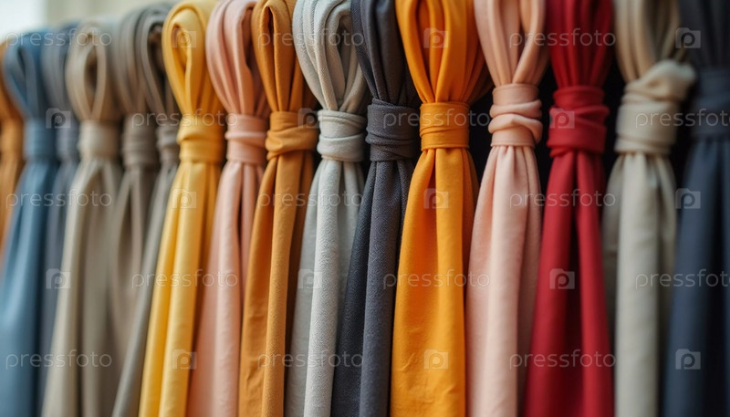 Замысловато завязанные занавески изящно висят в текстильном магазине, демонстрируя яркую гамму цветов, узоров и текстур в дневном свете. Генеративный ИИ