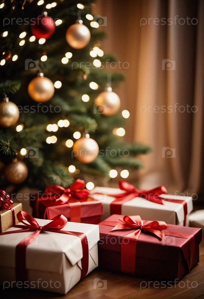 Уютная гостиная, украшенная праздничной рождественской елкой, украшенной сверкающими огнями и красочными безделушками, окруженная множеством тщательно упакованных подарочных коробок, ожидающих открытия. Искусство ИИ