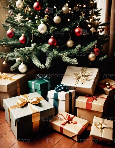 Празднично упакованные подарки, окруженные красочными рождественскими шарами под красиво украшенной елью во время радостного новогоднего сезона. Генеративный ИИ