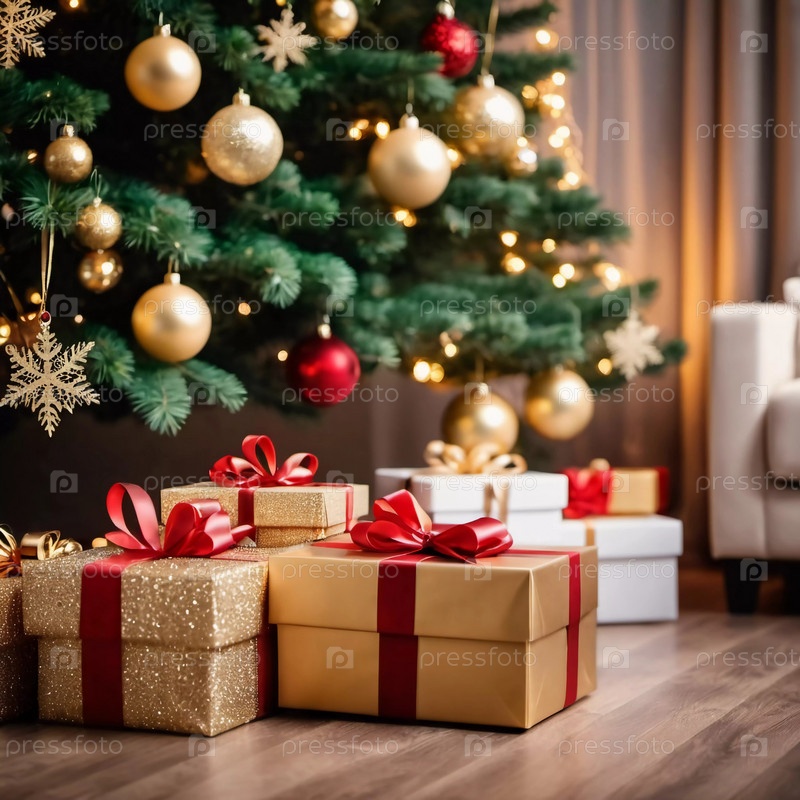Упакованные в разноцветную упаковку подарки лежат под наряженной елью, украшенной сверкающими рождественскими игрушками, создавая веселую и праздничную атмосферу празднования Нового года