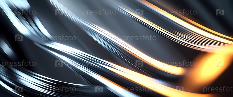 Текучие плавные линии, переплетающиеся на глубоком черном фоне, обогащенные яркими цветами и захватывающим эффектом боке, привлекающим внимание. Динамические световые следы в сером, синем и желтом цветах. Генеративный ИИ