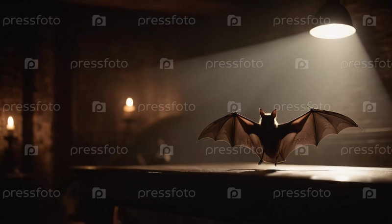 Летучая мышь, движется по темному коридору, наполненному теплым оранжевым светом. Атмосфера создает жуткую и напряженную атмосферу, усиливая таинственную атмосферу. Генеративный ИИ
