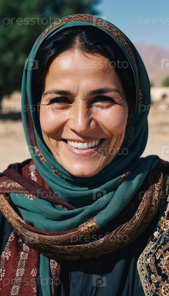 Радостная женщина 45 лет из Афганистана демонстрирует яркую улыбку, одетая в традиционную одежду. Она стоит уверенно, воплощая чувство мира в своей сельской общине. Генеративный ИИ