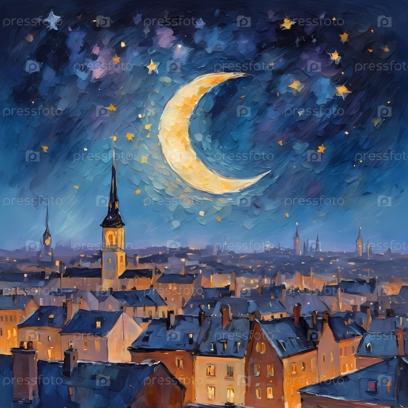 Золотые огни мерцают на крышах домов, полумесяц и разбросанные звезды освещают безмятежное ночное небо над прекрасным городским пейзажем. Генеративный ИИ