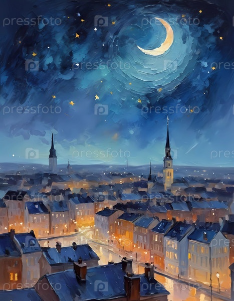 Золотые огни мерцают на крышах домов, полумесяц и разбросанные звезды освещают безмятежное ночное небо над прекрасным городским пейзажем. Генеративный ИИ