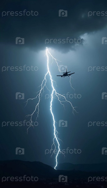 Самолет попадает в сильную грозу, окруженный темными облаками и освещенный яркими ударами молний, подчеркивающими опасность в небе. Причины авиакатастроф. Генеративный ИИ