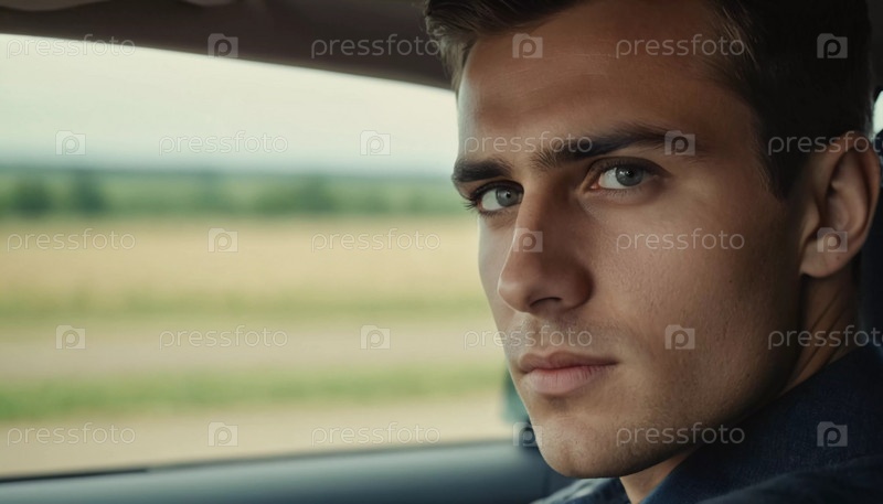 Молодой человек сидит на водительском сиденье, глядя в окно на обширное поле под тускнеющим сумеречным небом, погруженный в свои мысли во время поездки. Генеративный ИИ