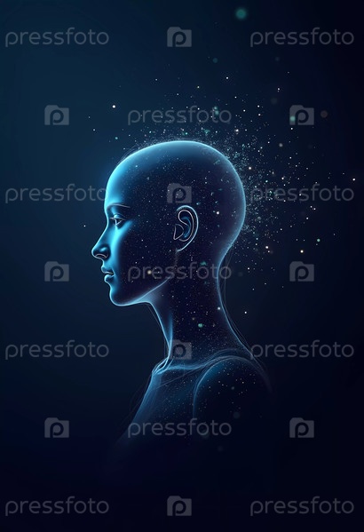 Этот поразительный цифровой дисплей демонстрирует профиль гуманоидной фигуры, окруженной светящимися частицами, которые создают эффект появляющихся данных, воплощая суть искусственного интеллекта. ИИ