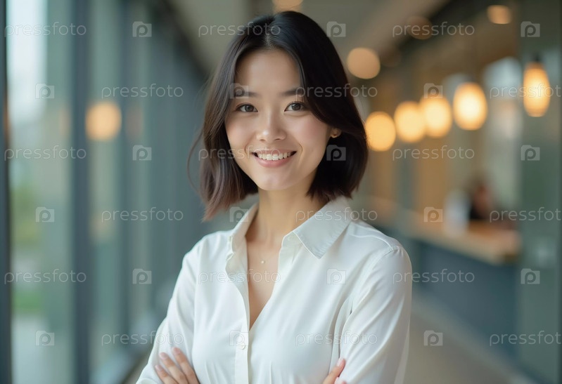 Молодой профессионал в белой рубашке стоит, демонстрируя теплую улыбку в современной офисной обстановке, наполненной мягким рассеянным светом. Симпатичная азиатская брюнетка со стрижкой боб. Генеративный ИИ