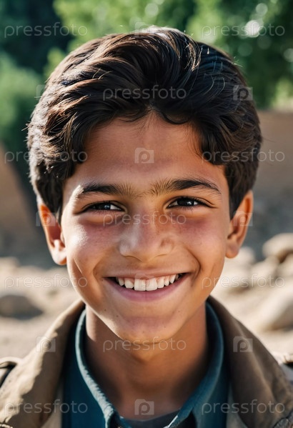 Веселый мальчик, около 10-15 лет, ярко улыбается на фоне потрясающего афганского пейзажа. На заднем плане изображены горы и зеленая растительность, демонстрирующая его живой дух. Генеративный ИИ