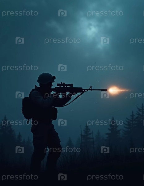 Силуэты военных солдат маневрируют сквозь густой туман, готовясь к активному противостоянию. Атмосфера напряжена, когда солнце начинает подниматься. Военные идут в ночную атаку. Генеративный ИИ