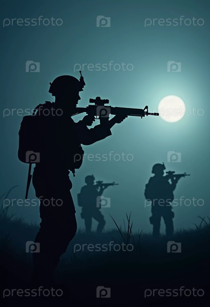 Силуэты военных солдат маневрируют сквозь густой туман, готовясь к активному противостоянию. Атмосфера напряжена, когда солнце начинает подниматься. Военные идут в ночную атаку. Генеративный ИИ