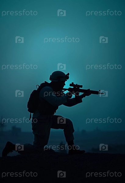 Силуэты военных солдат маневрируют сквозь густой туман, готовясь к активному противостоянию. Атмосфера напряжена, когда солнце начинает подниматься. Военные идут в ночную атаку. Генеративный ИИ