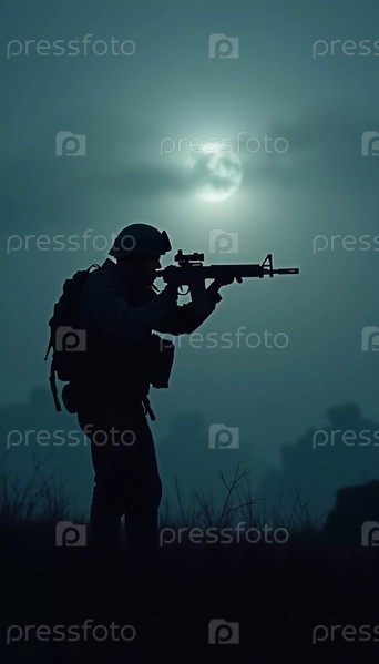 Силуэты военных солдат маневрируют сквозь густой туман, готовясь к активному противостоянию. Атмосфера напряжена, когда солнце начинает подниматься. Военные идут в ночную атаку. Генеративный ИИ