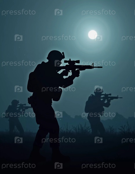 Силуэты военных солдат маневрируют сквозь густой туман, готовясь к активному противостоянию. Атмосфера напряжена, когда солнце начинает подниматься. Военные идут в ночную атаку. Генеративный ИИ