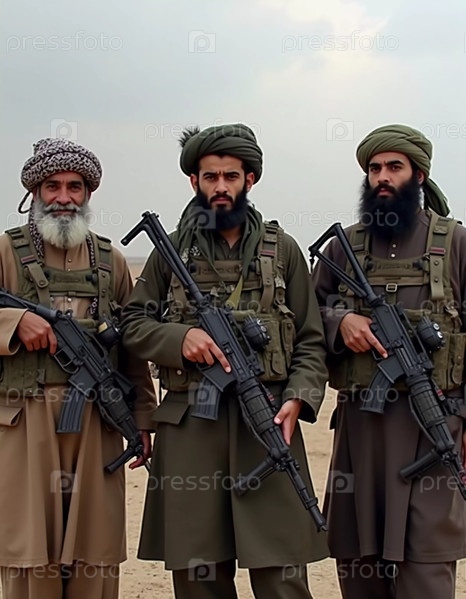 Группа вооруженных мужчин, одетых в традиционную одежду, стоит сплоченно, демонстрируя товарищество и готовность. Воинствующие мусульмане, похожие на Талибан или пакистанскую армию. Густая борода. Генеративный ИИ