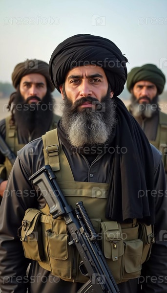 Группа вооруженных мужчин, одетых в традиционную одежду, стоит сплоченно, демонстрируя товарищество и готовность. Воинствующие мусульмане, похожие на Талибан или пакистанскую армию. Густая борода. Генеративный ИИ