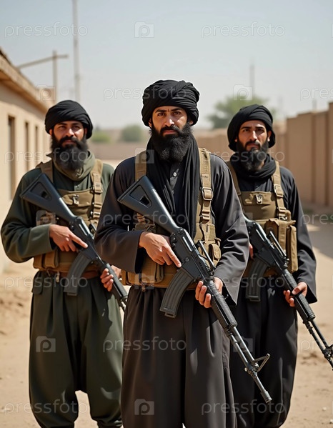 Группа вооруженных мужчин, одетых в традиционную одежду, стоит сплоченно, демонстрируя товарищество и готовность. Воинствующие мусульмане, похожие на Талибан или пакистанскую армию. Густая борода. Генеративный ИИ