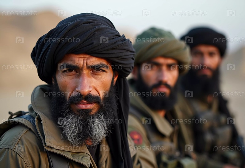 Группа вооруженных мужчин, одетых в традиционную одежду, стоит сплоченно, демонстрируя товарищество и готовность. Воинствующие мусульмане, похожие на Талибан или пакистанскую армию. Густая борода. Генеративный ИИ