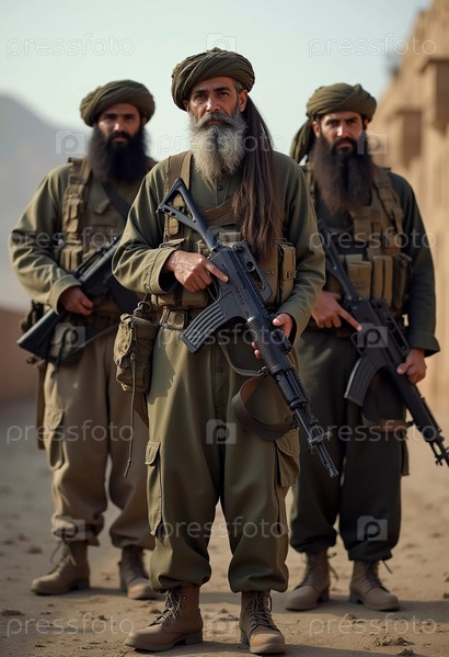 Группа вооруженных мужчин, одетых в традиционную одежду, стоит сплоченно, демонстрируя товарищество и готовность. Воинствующие мусульмане, похожие на Талибан или пакистанскую армию. Густая борода. Генеративный ИИ