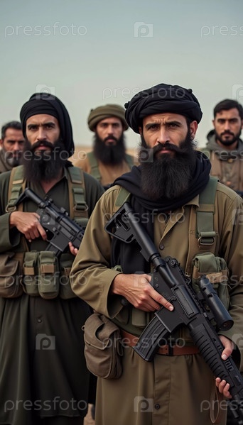 Группа вооруженных мужчин, одетых в традиционную одежду, стоит сплоченно, демонстрируя товарищество и готовность. Воинствующие мусульмане, похожие на Талибан или пакистанскую армию. Густая борода. Генеративный ИИ