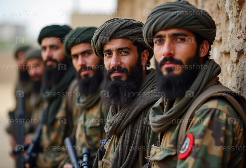 Группа вооруженных мужчин, одетых в традиционную одежду, стоит сплоченно, демонстрируя товарищество и готовность. Воинствующие мусульмане, похожие на Талибан или пакистанскую армию. Густая борода. Генеративный ИИ
