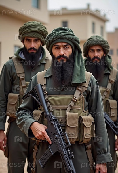 Группа вооруженных мужчин, одетых в традиционную одежду, стоит сплоченно, демонстрируя товарищество и готовность. Воинствующие мусульмане, похожие на Талибан или пакистанскую армию. Густая борода. Генеративный ИИ