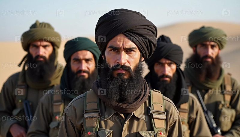 Группа вооруженных мужчин, одетых в традиционную одежду, стоит сплоченно, демонстрируя товарищество и готовность. Воинствующие мусульмане, похожие на Талибан или пакистанскую армию. Густая борода. Генеративный ИИ