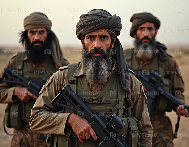 Группа вооруженных мужчин, одетых в традиционную одежду, стоит сплоченно, демонстрируя товарищество и готовность. Воинствующие мусульмане, похожие на Талибан или пакистанскую армию. Густая борода. Генеративный ИИ
