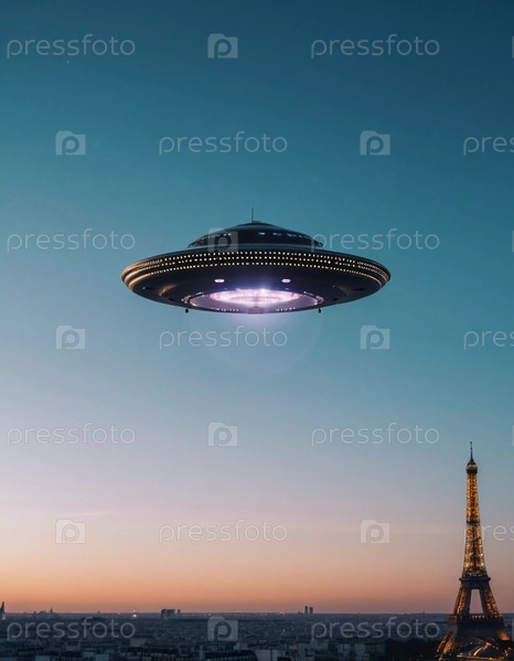 НЛО в форме диска зависает над Эйфелевой башней в Париже на закате, отбрасывая теплое сияние на городской пейзаж и освещая знаковую достопримечательность. Генеративный ИИ