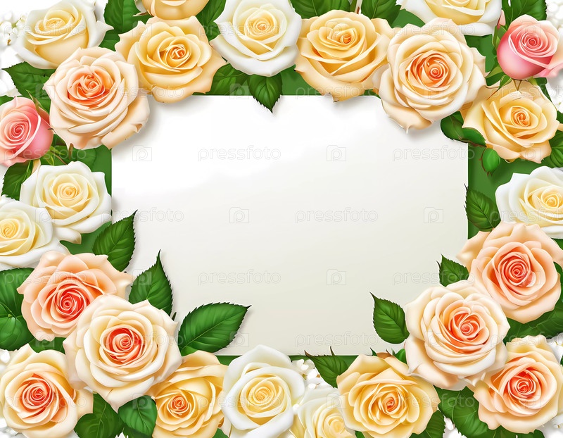 Нежные белые, желтые, розовые розы образуют красивую рамку вокруг пустой области для персонализированных сообщений или поздравительных открыток в любой обстановке. День рождения, 8 марта, День матери, День святого Валентина. Генеративный ИИ