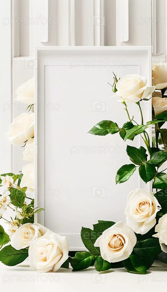 Нежные белые розы и мягкие бутоны создают элегантную рамку вокруг пустой открытки, идеально подходящую для личных сообщений или декоративных целей на любом мероприятии. С днем рождения, днем матери, днем святого Валентина. Генеративный ИИ