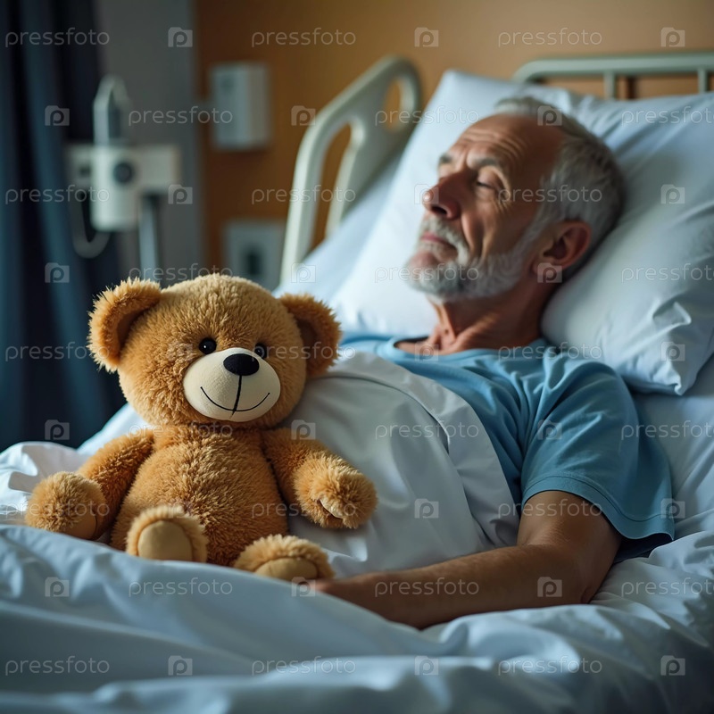 В тихой больничной палате пожилой мужчина лежит в постели с плюшевым мишкой рядом с ним. Мягкая игрушка символизирует комфорт, товарищество и надежду на пути к выздоровлению