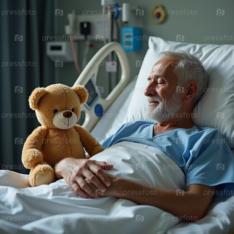 В тихой больничной палате пожилой мужчина мирно отдыхает в постели, рядом с ним мягкий плюшевый мишка. Теплое присутствие мишки дарит ему утешение, товарищество и чувство надежды