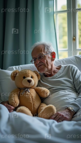 В больничной палате, наполненной мягким светом, пожилой мужчина сидит на кровати, нежно держа плюшевого мишку. Этот трогательный момент передает суть товарищества и стойкости в трудные времена