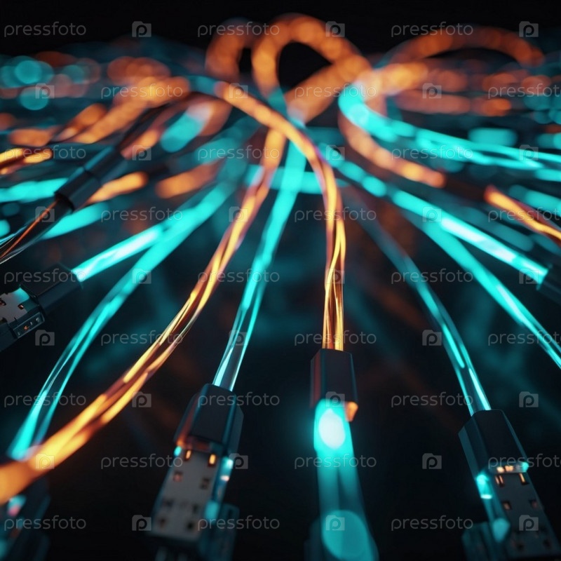Синие и оранжевые светящиеся провода скручиваются и переплетаются на темном фоне с боке-огнями. Черные кабели и разъемы со светящимися огнями и цепями соединяются, образуя сеть. Создано с помощью ИИ