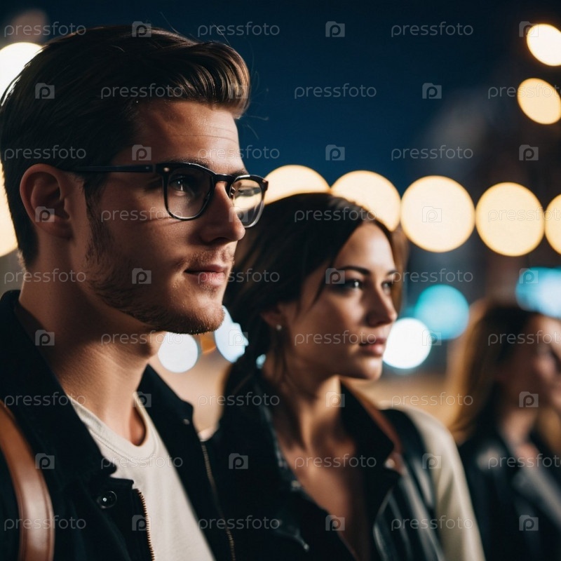 Двое друзей-влюбленных, мужчина и женщина, разделяют интимный момент на открытом воздухе в окружении теплого света, создающего волшебную атмосферу