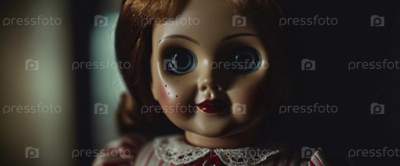 Тревожная кукла с темными глазами и рыжими волосами привлекает внимание в темной среде с мягким рассеянным освещением, отражающим жуткую атмосферу. Страшная кукла для ужасов и Хэллоуина. ИИ