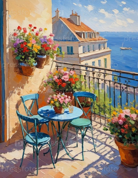 Солнечная терраса, окруженная яркими цветами, располагает к отдыху, предлагая захватывающий вид и уютное место со столиками и стульями. Терраса украшена цветущими цветами и живописным побережьем. Генеративный ИИ