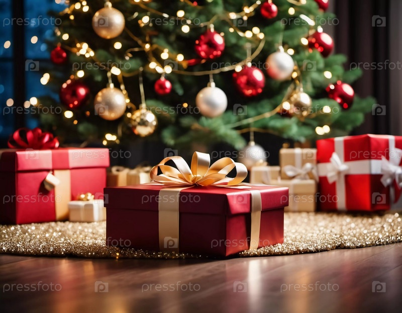 Упакованные в разноцветную упаковку подарки лежат под наряженной елью, украшенной сверкающими рождественскими игрушками, создавая веселую и праздничную атмосферу празднования Нового года