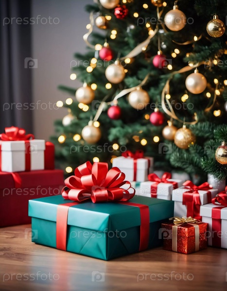 Упакованные в разноцветную упаковку подарки лежат под наряженной елью, украшенной сверкающими рождественскими игрушками, создавая веселую и праздничную атмосферу празднования Нового года