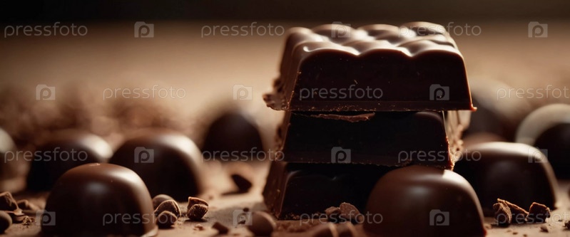 Ассорти из трюфелей из темного шоколада окружает квадрат из темного шоколада, все покоится на подложке из какао-порошка, что подчеркивает их роскошную текстуру и насыщенность. Генеративный искусственный интеллект
