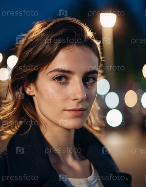 Молодая брюнетка 25 лет уверенно стоит на парижской улице в сумерках, мягкие городские огни освещают ее нежные черты, отражая спокойствие и городское очарование. Генеративный ИИ