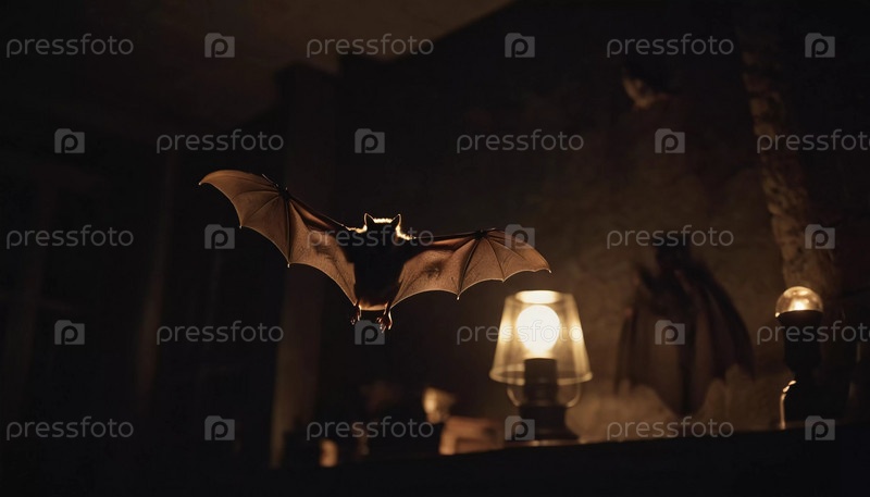 Летучая мышь, движется по темному коридору, наполненному теплым оранжевым светом. Атмосфера создает жуткую и напряженную атмосферу, усиливая таинственную атмосферу. Генеративный ИИ