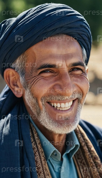Житель Афганистана, этот улыбающийся человек излучает тепло и счастье, демонстрируя богатое культурное наследие и принимая жизнь