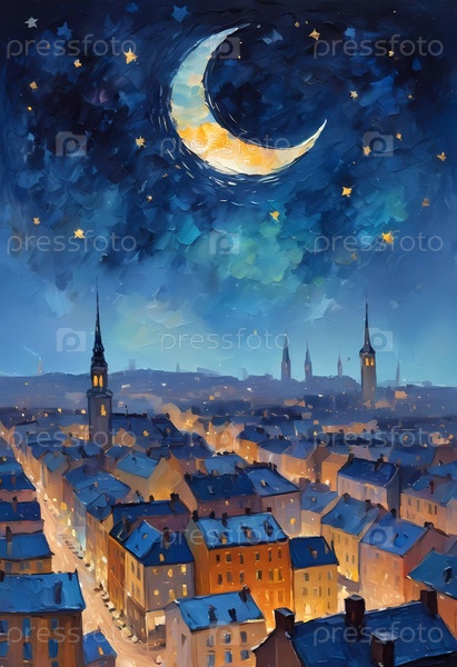Золотые огни мерцают на крышах домов, полумесяц и разбросанные звезды освещают безмятежное ночное небо над прекрасным городским пейзажем. Генеративный ИИ