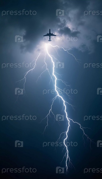 Самолет попадает в сильную грозу, окруженный темными облаками и освещенный яркими ударами молний, подчеркивающими опасность в небе. Причины авиакатастроф. Генеративный ИИ